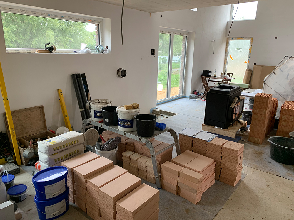 Die Internetrecherche hat die Ofenliebhaberin schließlich direkt zur Ofenmacherei im schönen Schwarzwald geführt, hier versteht man was vom Handwerk. Die Referenzen haben beeindruckt und der Designpreis überzeugt, anfang Dezember ging es mit einem Auto voller Musterkacheln zur ersten Absprache auf nach Köln. Die Entscheidung fiel auf die wunderschönen Tapetenkacheln mit denen der moderne Kachelofen mit abgerundetem Sichtfenster geschmückt werden sollte. Anfang Mai ging es für die Schwarzwälder Ofenmeister zum Arbeitsstart nach Köln.